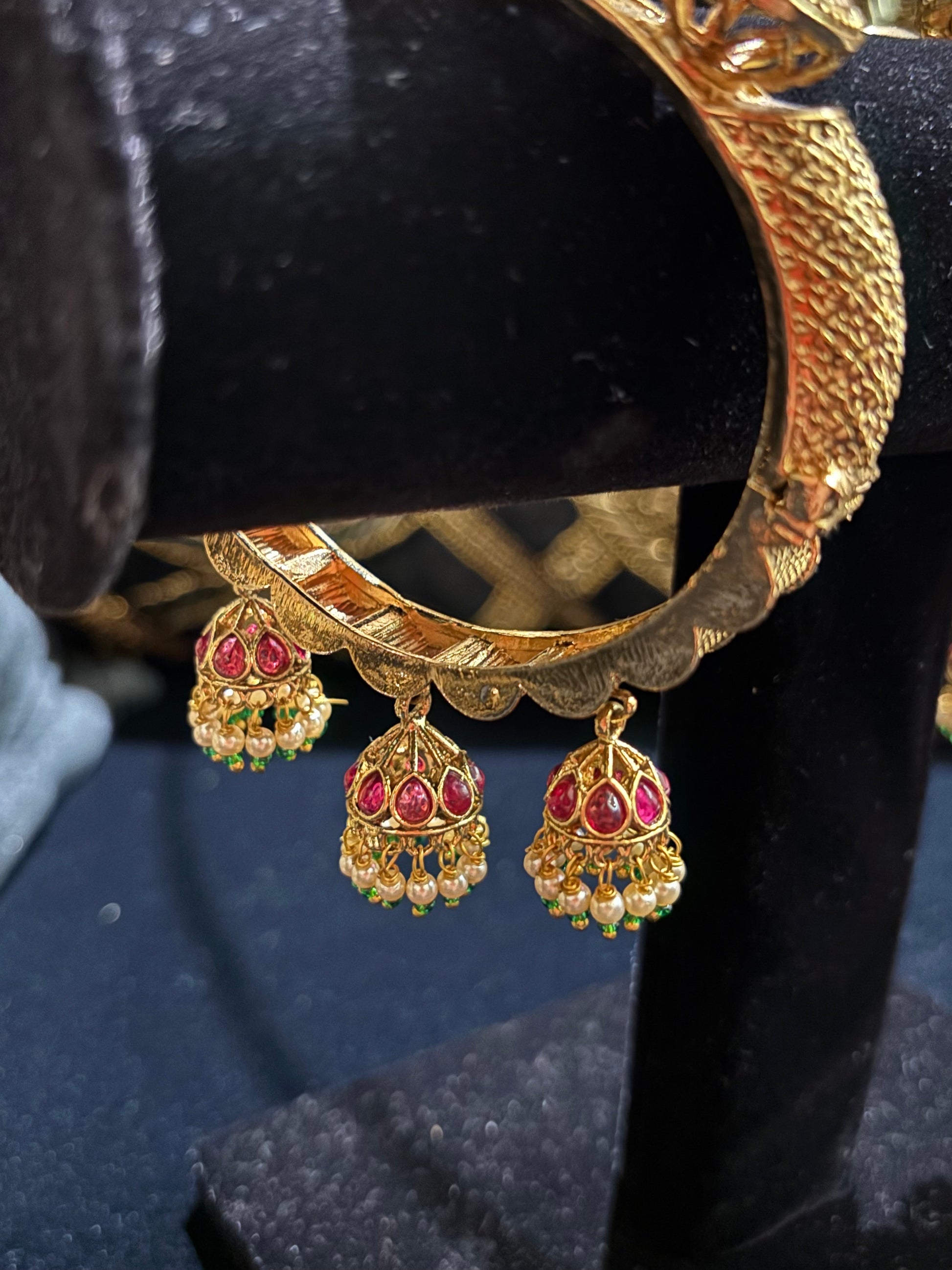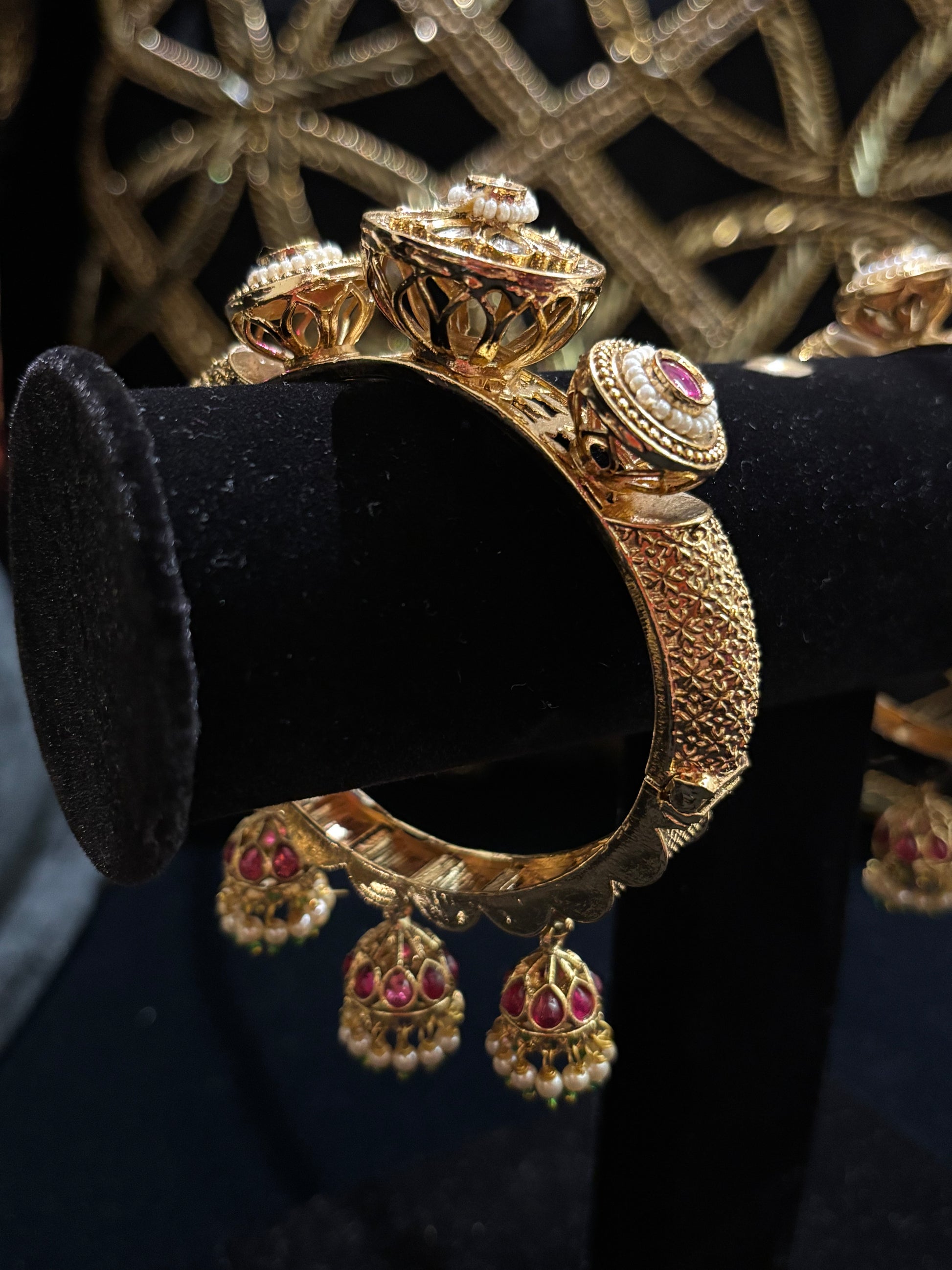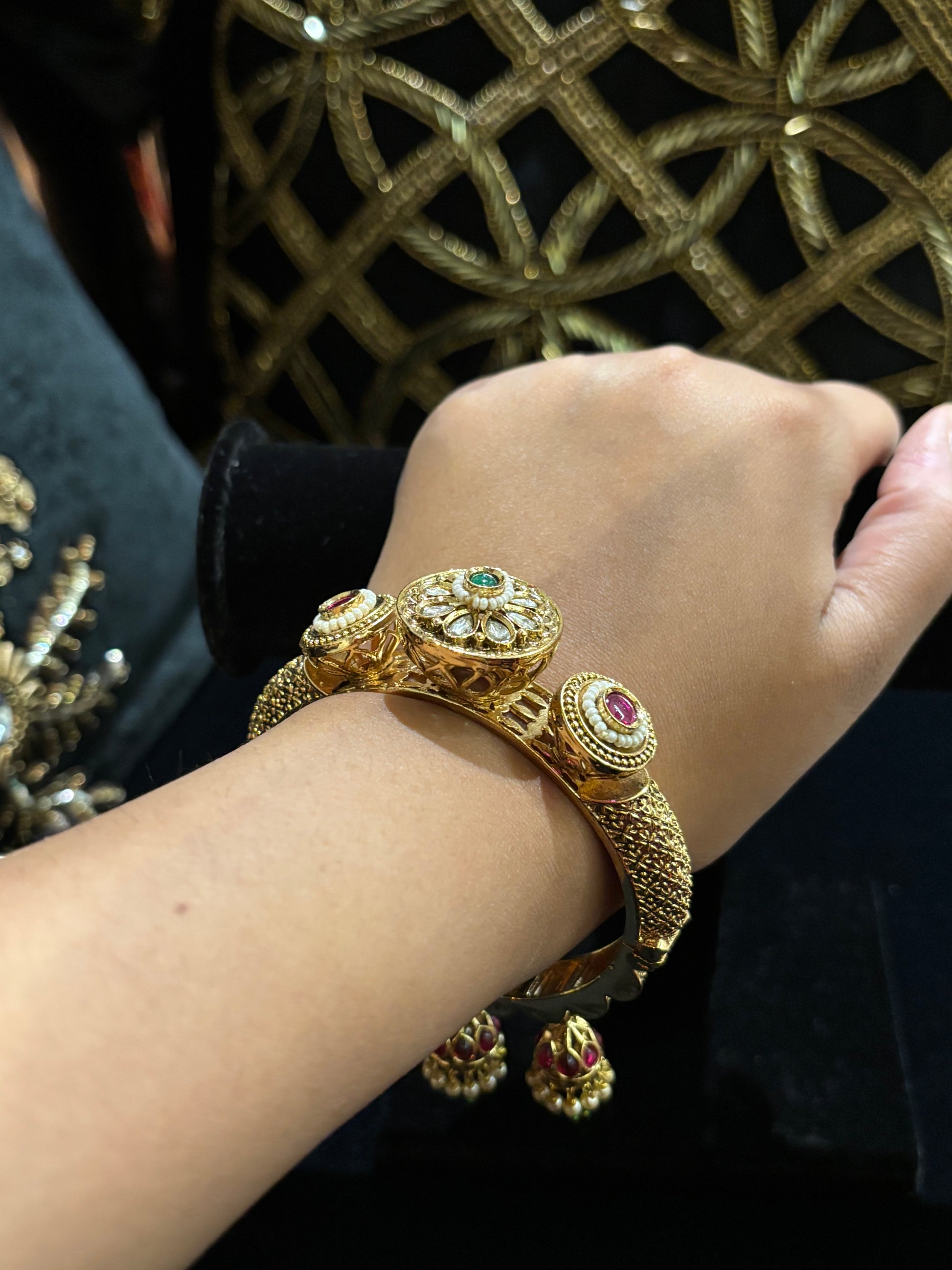 Rajwadi Kundan Kada ! A statement piece embellished with pearls, crystal stones and charming Jhumpa hangings! - a touch of timeless grace!